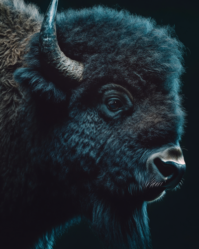A proud bison standing tall, Shot with a Nikon D850, 600mm f/4 telephoto lens, capturing the intricate details of his fur and expression, National Geographic quality, majestic colors, dramatic composition mid shot --ar 4:5