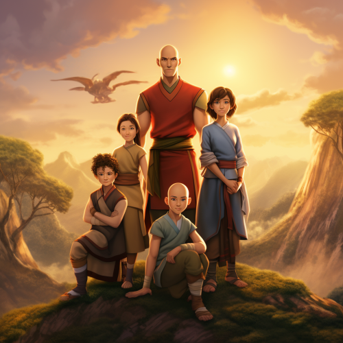 You are creating a 4k, realistic yet anime looking poster based on the cartoon show "Avatar the Last Airbender" that will be used as to show members from an Indian specifically Gujarati family. In the artistic depiction of our family as Avatar The Last Airbender characters, let's start with Aman He should be seen as 26 years old and this number should be on his clothing somewhere. He shouldbe 92kg with 5 feet and 11 inches in height and he shoud have brown, Indian skin. His airstyle should be simple and he should be smiling like the character Aang. He should wear typical monk clothes that are orange and have his airbender arrow tattoos showing on his arms and the tip of the arrow on his forehead. He should be riding a flying bison that looks exactly like the Avatar the Last airbender character "APPA". Character 2 should be ARYA who is a waterbender that is is 18 years old, 50 kg and has curly hair sitting next to AMAN on APPA.