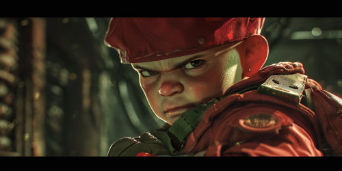 photorealistic of baby m.bison from street fighter, natural lighting, Nikon D850 105mm, f-stop 1.8, cinematic --ar 2:1