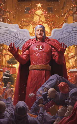 Christmas painting, oil painting, Marvel Comics' Magneto, in the style of Alex Ross and inspired by the works of Norman Rockwell --ar 10:16