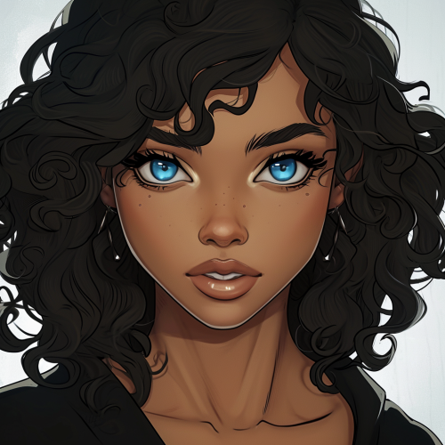 shoulder up photo of an animated lightskin mixed girl in her 20's with medium length curly dark bown hair and blue eyes with a round face, in the style of anime --v 6.0