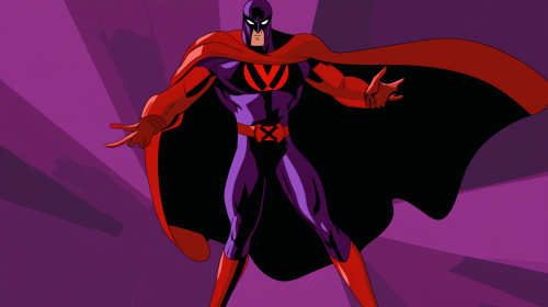 X-Men: The Animated Series (1990s) Costume Colors: Purple, red, and black. Details: This version is a modernized take on the classic costume, featuring a more detailed cape and armor. It also includes the large "M" symbol and mask. Description: Seen in the animated series, this outfit is an iconic portrayal of Magneto in animation. --ar 16:9 --style raw --stylize 0 --v 6.1