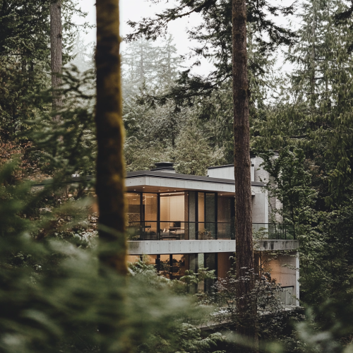 A dark forest at night, typical of modern Japan. The trees are tall and thin, with familiar species like cedar and pine. The ground is covered in fallen leaves, and there are small paths winding through the woods. Faint streetlights from a nearby town cast a subtle glow in the distance, while the air feels cool and damp. The atmosphere is quiet but not too eerie, with hints of modern life blending into the natural setting. --ar 16:9