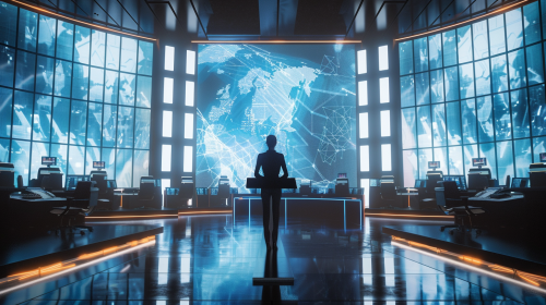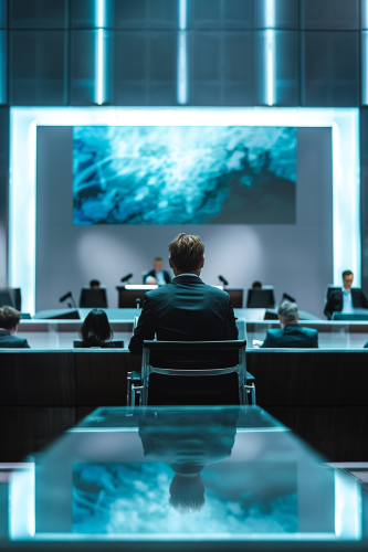A futuristic courtroom with bright LED lighting, minimalist furniture, and large digital screens in the background, a future educator practices their speech in a sleek setting, standing at a glass podium. The background shows legal officials in modern attire, focused on the speaker. Created Using: ultra-modern design, digital screens, clean lines, soft lighting, realistic textures, high-tech setting, cinematic style, sharp focus --ar 16:9 --v 6.0