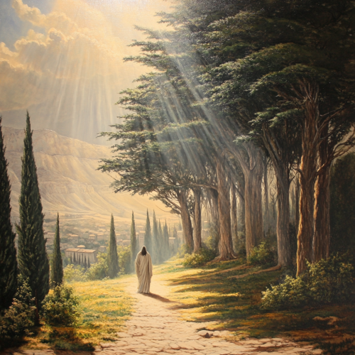 the Cedar Trees of Babylon vast and mighty. They bow gently to the Lord Jesus Christ as he walks towards them bathed in light. Paint it in a traditional oil painting style.