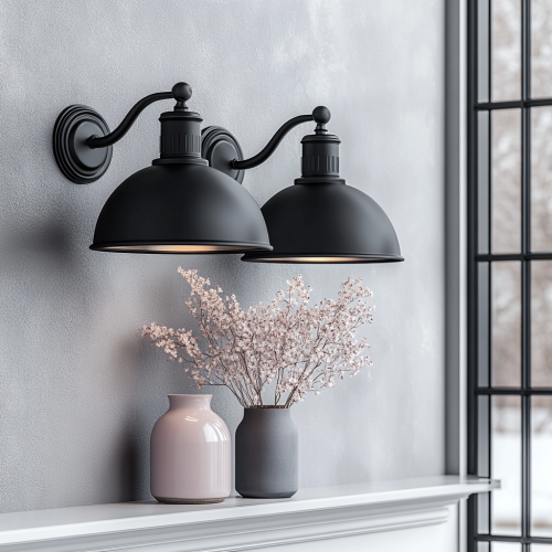 Generate an attractive product mockup featuring two wall-mounted light fixtures with black shades and LED lights on the top. The background is a neutral color with subtle lighting. Ensure high-quality, attention-grabbing, and realistic details for the best viewing experience. Use the aesthetic of stock photography images. This will help create visually appealing visuals.