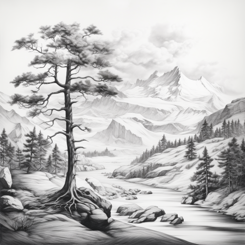 modern, abstract, artsy, pencil sketch of an alpine landscape with a river, cedar tree, poster art, wallpaper