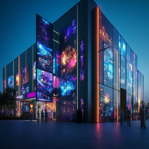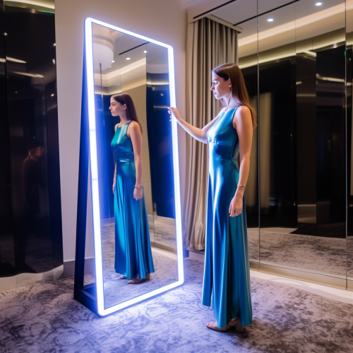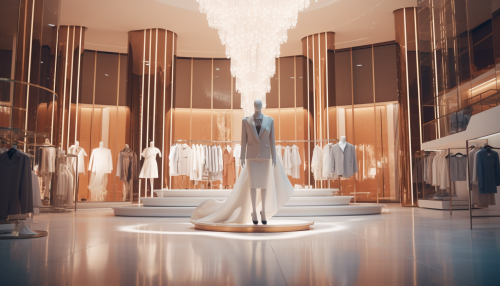the most luxurious clothing store interior, showroom, lit wall panels, chandelier modern, luxury clothing store interior, elegant, 3/4 view, boutique, couture, spacious floor, cinematic lighting, grand ceiling, establishing shot, trendy, wall mannequins on LED stands against the walls, fancy wall panels, backlit, LED lighting --aspect 7:4