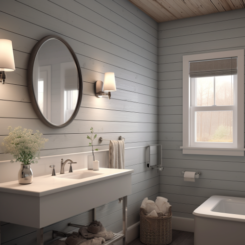 A hyper photo realistic bathroom with shiplap wall. shiplap painted in hex code A0998F. flat angle ar 16:9 with sconce lighting and framed mirror