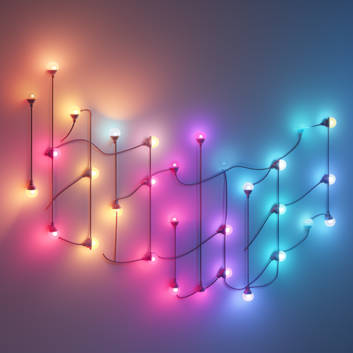string of large colorful led lights on a beige wall, isometric, 3D, minimalist