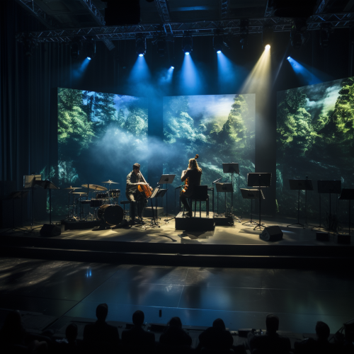 a filmprodcution set with a 8m LED wall in a nice theatre with a musician performing on a stage, backlight, photography
