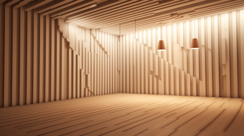 design, stripes interupted, geometric wallpaper, in the center the wooden bars are close together, becoming scattered towards the sidesrealistic, few vertical LEDs, interior design, top center text Led "Hello World", Wall design, a white wall, 8 meters long and 4 meters high, behind the wall a huge 30 meters long wall and 15 meter high, small Wall design with light wooden bars that are narrow, vertical wooden bars, just very few integrated vertical LED lights. Design radiates towards the sides, topic of design ist sun shining and rivers --ar 16:9