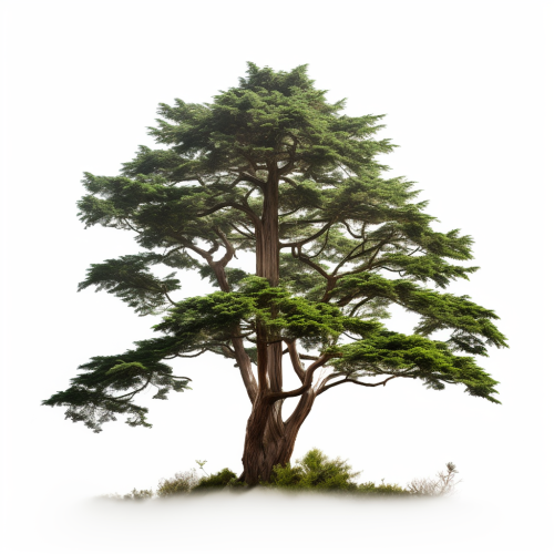 a minimalist photo of a very large cedar tree with green foliage against a simple white background