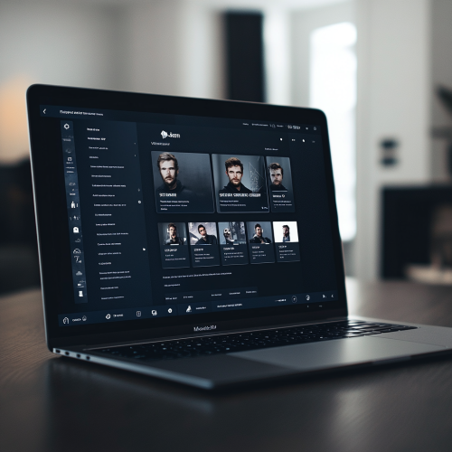 A high-resolution image of a modern laptop displaying a clean and minimalistic actor website application. The laptop is centered, facing directly forward, with the screen showing a user profile page that includes a dashboard, photos of the actor and a video section. The background is simple and blurred to keep the focus on the laptop screen. The overall color scheme is dark mode and professional, with a sleek, modern design aesthetic.