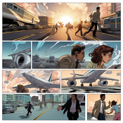 William Vance's comic book page, with 5 panels, with artwork depicting scenes from an airport two people running on the luggage carrousel : : edgy, creative, strange, detailed
