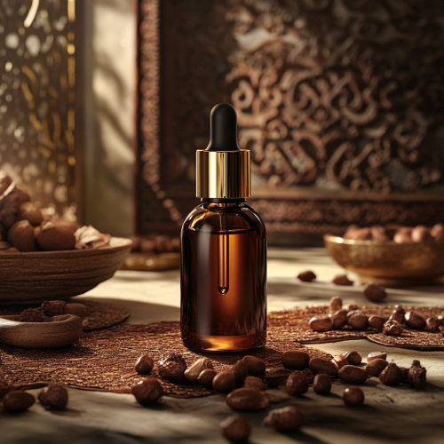 Create an advertising image in 1080x1080 format for a natural and organic cosmetic product made with argan oil. The product should be displayed in an elegant and prestigious manner, incorporating natural elements and organic textures that evoke luxury. Include a subtle and dark Moroccan touch in the background, with traditional patterns and warm colors reminiscent of Morocco (e.g., shades of brown, gold, and orange). Highlight the argan composition in an artistic and sophisticated way.