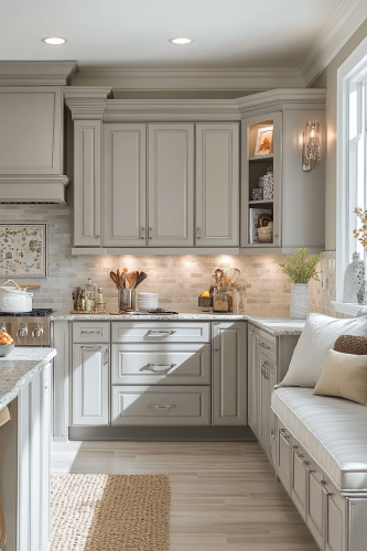 Photograph a comforting kitchen with Cloudy Comfort gray kitchen cabinets in a soft, soothing gray. Pair these cabinets with a speckled granite countertop and a backsplash of hand-painted tiles depicting gentle scenes. Include a cozy seating area with plush cushions and warm throws for a relaxed vibe. The flooring should be light bamboo, contributing to the room's airy feel. This kitchen should serve as a sanctuary, ideal for unwinding after a long day. Neat and organized. Camera: DSLR - Canon EOS 5D Mark IV. Lens: Canon EF 24-70mm f/2.8L II USM. Composition: Wide shot, room-centered, horizontal orientation, balance between furniture and space. Film: Digital, high resolution, color profile sRGB. Camera settings: ISO 400, f/2.8, 1/60 sec. --ar 2:3 --v 6.1 --s 250