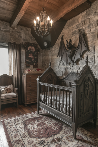 Depict a nursery with the Gentle Gargoyles theme, where the traditional guardians of Gothic architecture are reimagined as friendly protectors. The room features stone-gray walls adorned with playful gargoyle cartoons and sculptures that smile and engage. The furniture is robust and stylized to resemble parts of a Gothic cathedral, providing a playful yet safe environment. This nursery should feel like a cheerful sanctuary, where the gargoyles are friends who guard and play. Neat and organized. Camera: DSLR - Canon EOS 5D Mark IV. Lens: Canon EF 24-70mm f/2.8L II USM. Composition: Wide shot, room-centered, horizontal orientation, balance between furniture and space. Film: Digital, high resolution, color profile sRGB. Camera settings: ISO 400, f/2.8, 1/60 sec. --ar 2:3 --v 6.1 --s 250