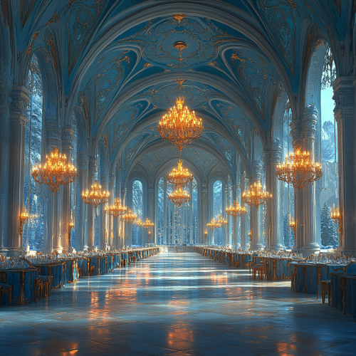 Hyper-realistic depiction of Sanctuary Hall, a grand and intricate space within the Free Company house, used for gatherings, strategy meetings, and celebrations. The hall features vaulted ceilings with delicate, frost-kissed patterns that glisten in soft, ambient light. To the left, a cozy lounge area with deep blue and silver plush sofas surrounds a central hearth with a magical flame, softly reflecting off an ornate frost-framed mirror above. Bookshelves filled with curiosities and ancient tomes line the walls, adding depth and history to the space, with soft furs draped over the seating. To the right, a stately dining area with dark, polished wood tables set with crystal goblets, silverware, and embroidered blue and white runners. Centerpieces of winter flowers and unmeltable ice sculptures add elegance. Frosted glass partitions create a sense of privacy without closing off the space. The central Meeting Circle features a sunken area with cushioned benches surrounding a glowing circular table that displays maps and battle projections. A skylight above allows natural light to filter in, with snow gently falling, creating an ever-changing view of the sky. At the far end, a stage with a banner of Snow Sanctuary flanked by candelabras with warm, flickering light. The backdrop is adorned with intricate carvings of snowflakes and icy landscapes. The air is filled with the scent of pine and cedar, ambient music drifts softly, and the atmosphere is both regal and inviting, blending warm and cool tones harmoniously. Lens: high-definition, ultra-realistic textures, cinematic lighting with volumetric effects, aspect ratio 16:9 for an expansive, immersive view, capturing the essence of elegance, comfort, and strategic importance. --s 750