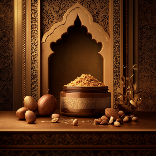 Create an advertising image in 1080x1080 format for a natural, organic, and luxurious skincare product an argan-based mask. The product should be presented in an elegant and prestigious manner, incorporating organic elements that evoke high-end beauty. Include a subtle and dark Moroccan touch in the background, featuring traditional patterns and warm, rich colors reminiscent of Morocco (e.g., deep browns, gold, and terracotta). Highlight the organic nature and sophistication of the mask in an artistic and visually appealing way, 1080*1080