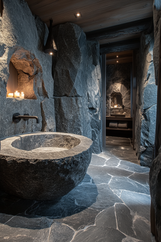 Capture a full view of a Western Gothic bathroom using various types of stone, from slate to marble, to create a tactile and visually appealing space. Highlight the contrast between rough natural stone walls and smooth stone basin, enhancing the tactile experience. Use minimalist decor to focus attention on the raw beauty of the materials, with strategic lighting showcasing the unique patterns in the stone. This image should be photographed in a hyper-realistic style, emphasizing the depth and texture of the stone, inviting viewers to click and learn more about creating a Stone Sanctuary bathroom. Neat and organized. Camera: DSLR - Canon EOS 5D Mark IV. Lens: Canon EF 24-70mm f/2.8L II USM. Composition: Wide shot, room-centered, horizontal orientation, balance between furniture and space. Film: Digital, high resolution, color profile sRGB. Camera settings: ISO 400, f/2.8, 1/60 sec. --ar 2:3 --v 6.1 --s 250