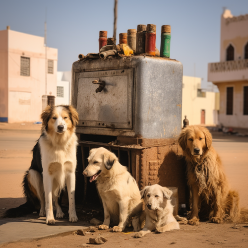 feral dogs in morocco eating from a food and water dispensor in a local town