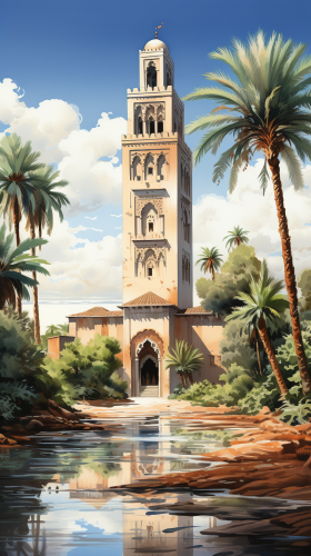 Illustration dessin, Mosquée Koutoubia Maroc. --ar 9:16 --s 300