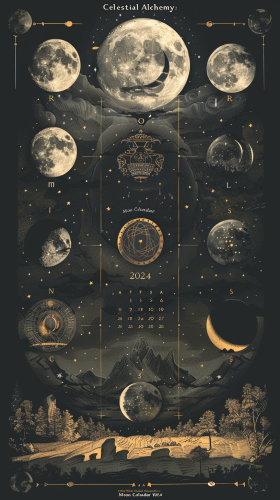 Title: "Celestial Alchemy: Moon Calendar 2024" Description: Create a moon calendar for 2024 with an alchemical theme. Include accurate moon phases and celestial motifs corresponding to each month's dates. Ensure the title is prominently displayed in the image. --ar 9:16