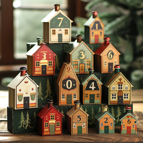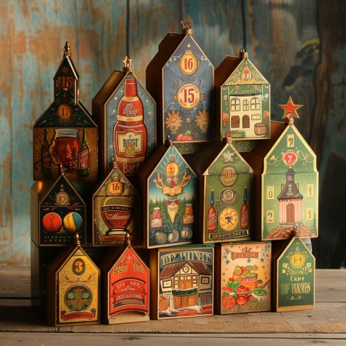 make a colourful 3D advent calendar with 24 closed doors with chrismas prints on it. The calender should have a beer theme and should be made of cardboard and be a bit children-ish