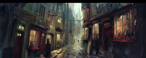 Fantasy Iceland, Diagon Alley, Painted, Simple, Illustration, Concept Art, Modern Time, Character Design, Digital Art --ar 5:2