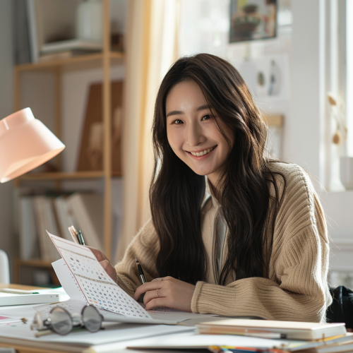 Happy Korean woman in her 20s, diligently checking her calendar to ensure important dates are not missed. She has a modern, casual style, with long black hair, wearing comfortable yet fashionable clothing. She's seated at a well-organized desk in a bright, cozy room, with natural light illuminating her joyful expression. The setting should be relatable, with a touch of vibrant colors to reflect her energetic and optimistic personality