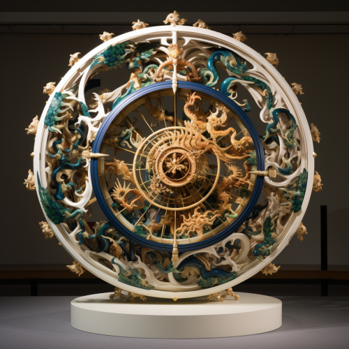 HUGE, 20 feet in diameter, magical time/calendar device, NOT ASIAN, modern elements, wood, porcelain, cream, dark blue , greens, complicated, gears, moving parts horizontal and vertical, small golden dragon scales, in the style of Thomas Heatherwick , Victor Horta , colors of Anne Bachelier , volumetric lighting