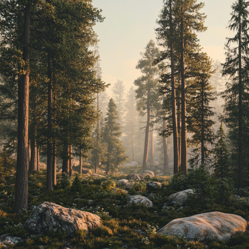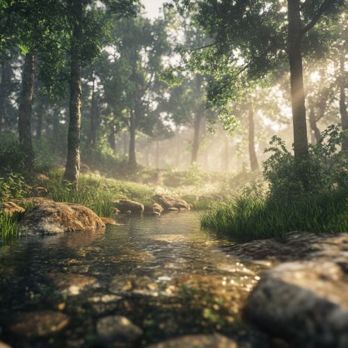 A small clear stream in A quiet forest scene at dawn, mist drifting among tall, ancient trees and rocks. Soft, natural colors of ivory, green, and subtle gold to evoke tranquility, photo realistic, 4k