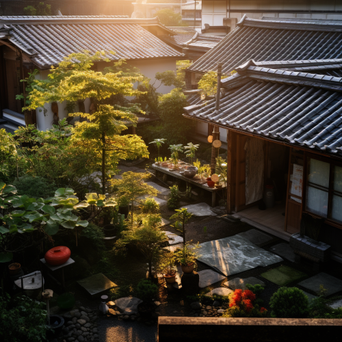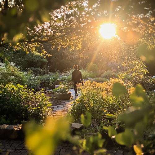 A gardener watering plants in a vibrant garden, with morning sunlight filtering through, creating a peaceful and nurturing scene. Taken with an iphone 15 pro