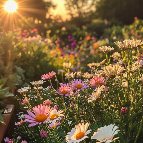 Morning light illuminating a lush garden filled with blooming flowers, soft rays highlighting the beauty and tranquility of the early day. Taken with an iphone 15 pro