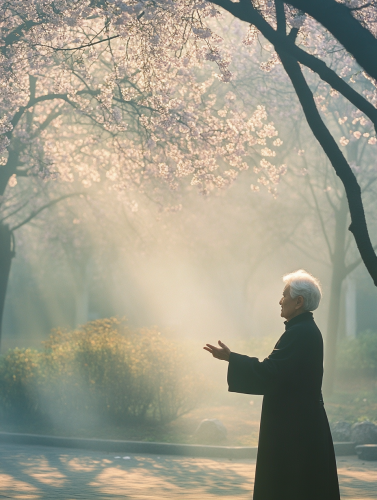 Beijing, China, 2000, An elderly woman practicing tai chi alone at dawn in a park, light mist around her, cherry blossoms blooming, calm and focused, Kodak UltraMax 400 --ar 3:4 --v 6.1