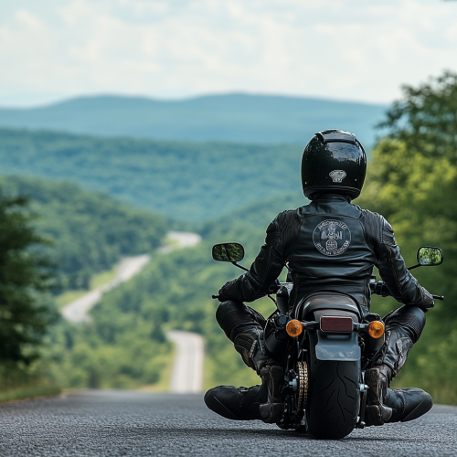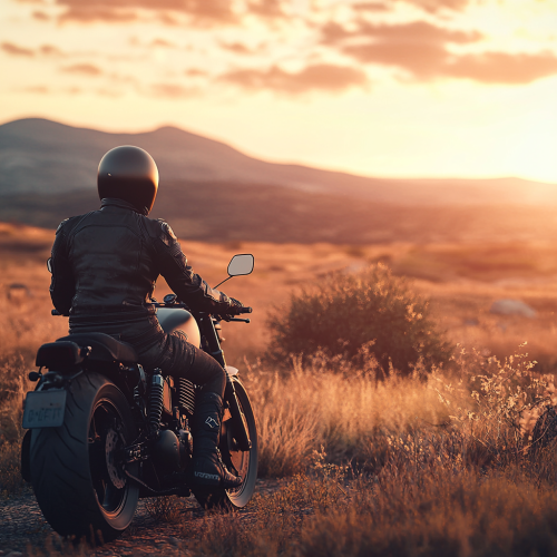 A realistic image of a motorcyclist practicing stress management techniques before or during a ride. The scene should show a calm and focused motorcyclist in full gear, sitting on their motorcycle in a serene environment, perhaps with a beautiful landscape in the background. The motorcyclist should be performing deep breathing exercises or visualizing a calm road ahead. The atmosphere should convey a sense of tranquility and preparedness for safe riding. The image should also subtly highlight the importance of stress management in ensuring safe motorcycle driving.