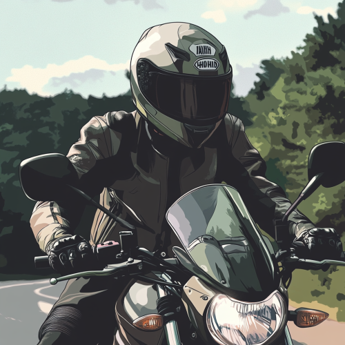 Create a realistic image of a motorcyclist on a scenic road, focused and calm. The motorcyclist is practicing deep breathing techniques while riding. The scene should convey a sense of relaxation and concentration, highlighting the importance of staying calm and focused for safe riding. Include elements like a clear sky, a peaceful road, and the rider's serene expression. The focus is on the rider's composed demeanor and controlled breathing.