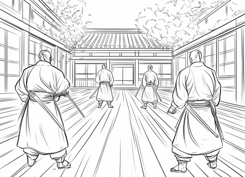 A traditional dojo where samurai are practicing sword techniques. designed as a coloring page. All in black and white with thick bold lines, perfect for coloring. --ar 11:8