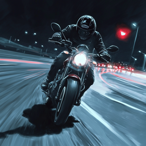 A realistic illustration of a motorcyclist riding on a highway at night, looking drowsy and fatigued. The scene should convey the effects of insufficient sleep on driving skills, with a focus on reduced concentration and slower reaction times. Include subtle visual cues, like droopy eyelids or blurred vision, to emphasize the dangers of driving while tired. The background should show blurred road signs and headlights to highlight the risk of accidents due to impaired driving. The image should reflect the serious consequences of sleep deprivation on motorcycle safety.