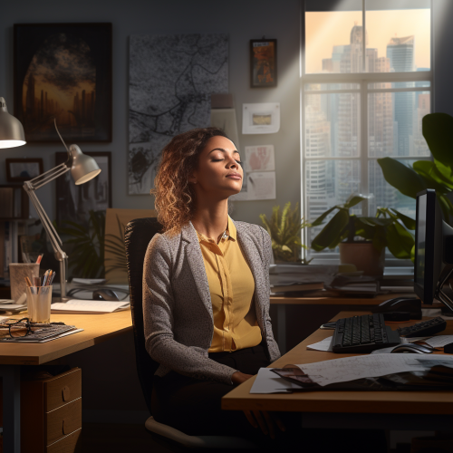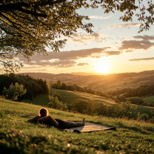A cozy, evening scene in the countryside near Lisle-sur-Tarn, with the last rays of sunlight touching the rolling hills. In the foreground, a person is lying on a yoga mat outdoors in a quiet field, practicing deep breathing techniques as the sun sets. The soft, twilight atmosphere and the tranquil setting create a perfect backdrop for relaxation and sleep optimization. High resolution, 4k. --ar 1:1 --v 6.1 --style raw