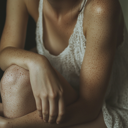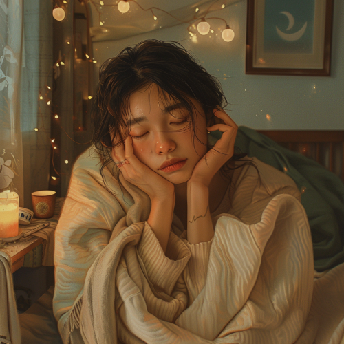 An ultra-realistic portrait of a woman sitting alone, practicing self-care in a moment of deep grief. Her face is marked by subtle signs of sadness, yet her expression also shows resilience and inner strength. She is gently holding her face or wrapping herself in a cozy blanket, sitting in a softly lit room. Around her are small symbols of self-care, like a candle, a warm drink, and a book. The scene should feel intimate, with soft, warm colors and intricate details, inspired by hand-drawn illustrations. The overall mood is raw, vulnerable, but hopeful, with fine lines and delicate textures. --v 6.0