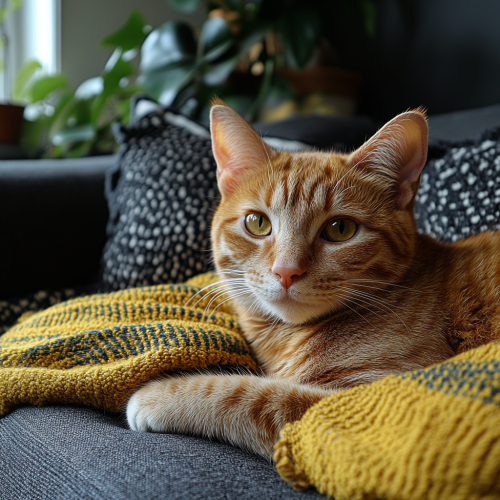 Una fotografÃa de un gato naranja realista, sereno y tranquilo, con orejas erguidas y ojos abiertos en una expresión relajada, su cuerpo está estirado cómodamente en un apartamento ordenado y acogedor, con muebles bien dispuestos y un ambiente cálido. Fondo de un apartamento iluminado por la luz natural, tonos cálidos y suaves dominan la escena, l --v 6.1 --s 750