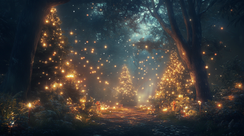 enchanted christmas festival in a clearing in an ethereal beautiful dark forest at night, fantasy christmas scene, mysterious forest, hauntigly beautiful image --ar 16:9