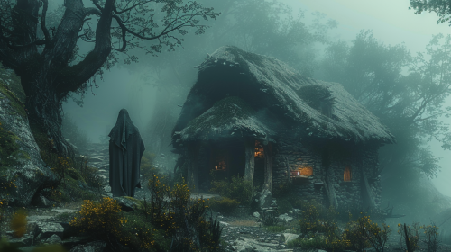 wide shot, hag, horrific and dominating, looking out from her hut, large cauldron, her hut is located inside a misty dark forest, dnd grim dark art, DnD atmosphere, 8k digital, super resolution, --v 6.0 --s 750 --ar 16:9