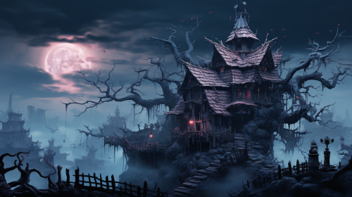 Baba Yaga's hut perched on chicken legs, surrounded by twisted trees and eerie mist with a dark and spooky ambiance, high resolution, detailed faces, in the style of traditional oil painting, light pink and dark cyan, highly detailed illustrations, high - contrast shading, 8k --v 5.2 --stylize 300 --ar 16:9