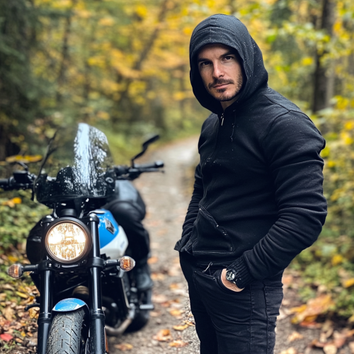 ominous looking 30-year-old man with dark pants, a black hoodie, and a black motorcycle helmet, standing on a walking trail next to a blue and white motorcycle