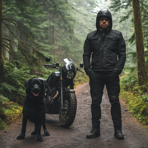 ominous looking 30-year-old man with dark pants, a black hoodie, and a black motorcycle helmet, standing on a walking trail next to a large black dog and a motorcycle