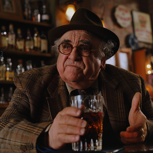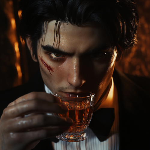 photorealistic Close-up of an elegant man, with black hair and brown eyes, wearing formal attire including a bow tie, sipping from the whiskey glass he holds to the camera. The scene is set at night under soft lighting, highlighting detailed facial features like the scar on one cheek or the furrowed brow that adds depth to his expression as he drinks noir - - style raw - - v6.1