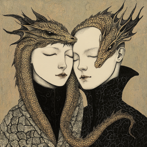 Create an Edward Gorey-style illustration featuring two figures closely entwined, their garments adorned with intricate dragon motifs. Use meticulous cross-hatching to depict texture and depth, emphasizing the interplay of light on the reflective fabrics and the fine details of the embroidered dragons. The figures should have emotionless expressions, capturing a sense of quiet tension and intimacy. Their poses evoke subtle, unspoken connection. Maintain a minimalist background, using negative space effectively, with perhaps faint structural elements or abstract patterns. Incorporate subtle symbolic motifs--such as dragons or geometric shapes embedded within their attire--to hint at hidden narratives. The composition should blend eerie elegance and surreal storytelling, mirroring the enigmatic charm characteristic of Gorey's work.